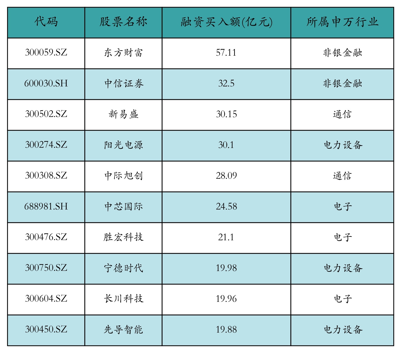 两市共有3440只个股有融资资金买入,其中东方财富、中信证券、新易盛排名前三,买入金额分别57.11亿元、32.5亿元、30.15亿元。融资买入额前10个股详情见下表: