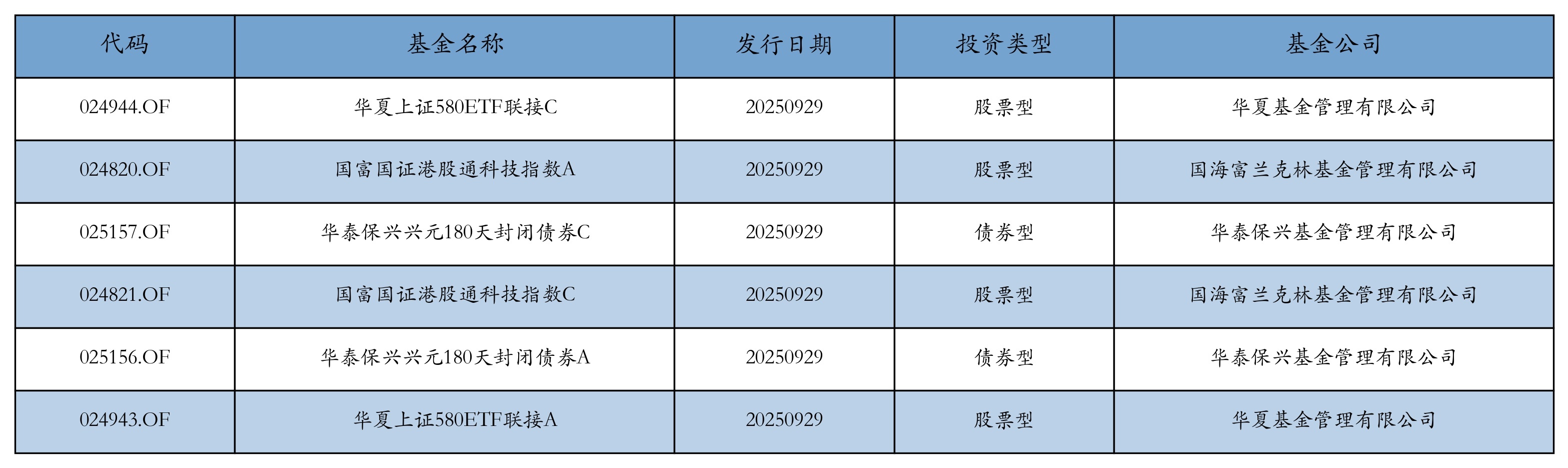 昨日有6只新基金发行,分别为:华夏上证580ETF联接C、国富国证港股通科技指数A、华泰保兴兴元180天封闭债券C、国富国证港股通科技指数C、华泰保兴兴元180天封闭债券A、华夏上证580ETF联接A,详情见下表: