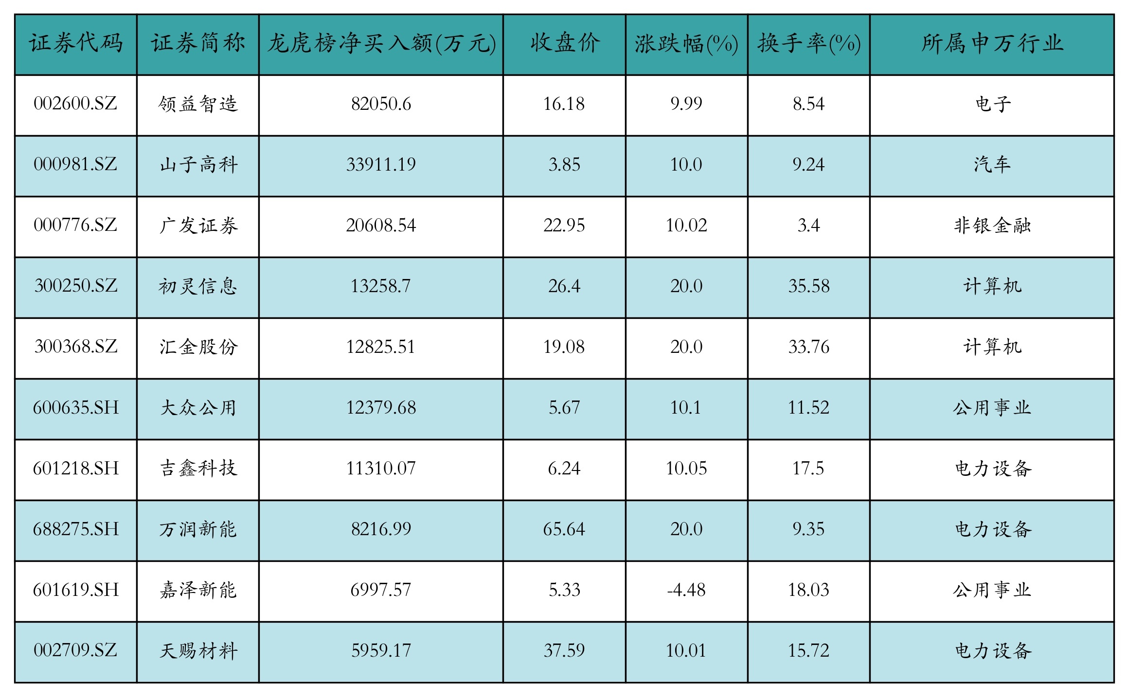 昨日龙虎榜营业部净买入额前10详情见下表: